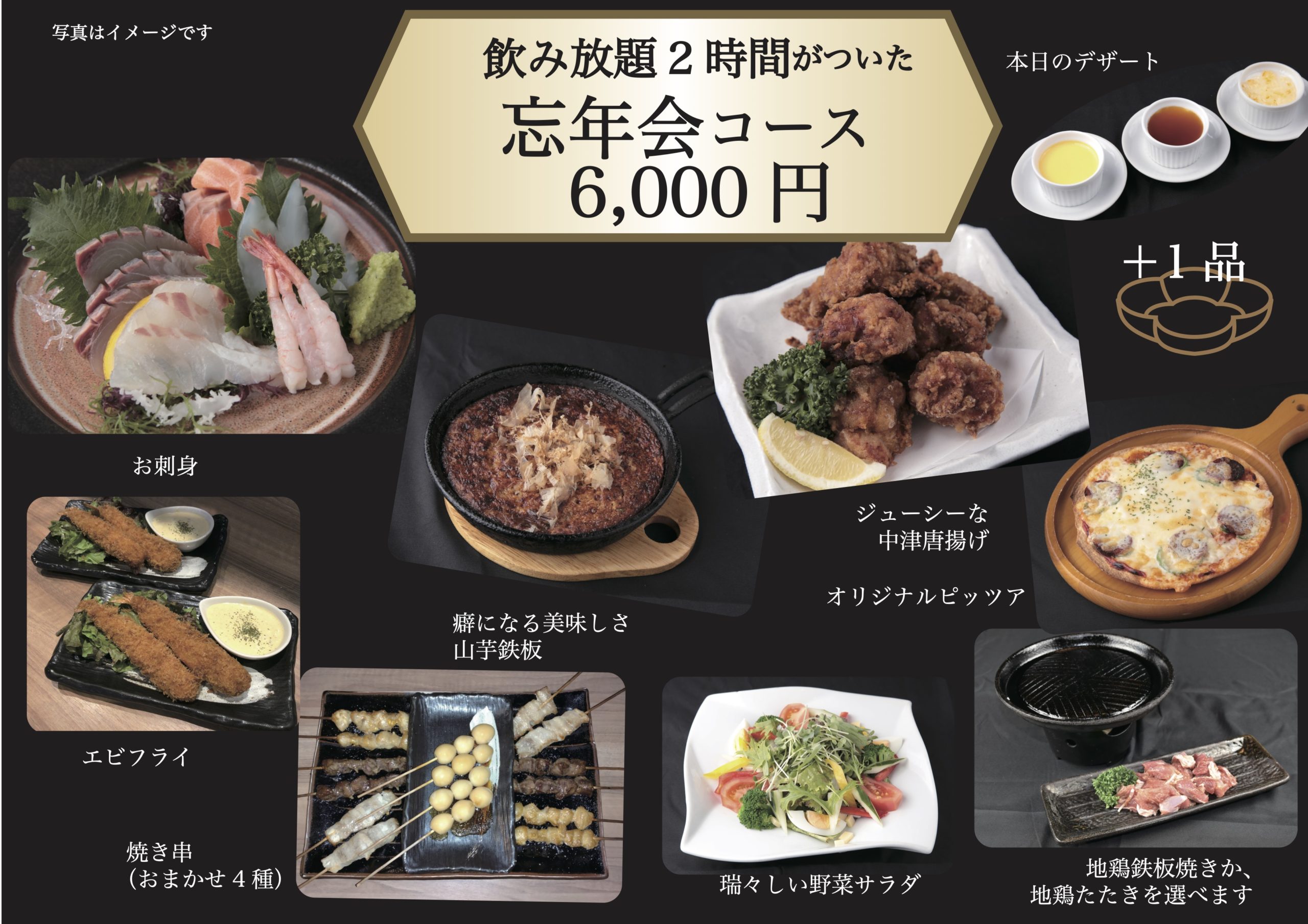 忘年会コース6,000円【飲み放歳2時間付き】追加オーダーもできます。