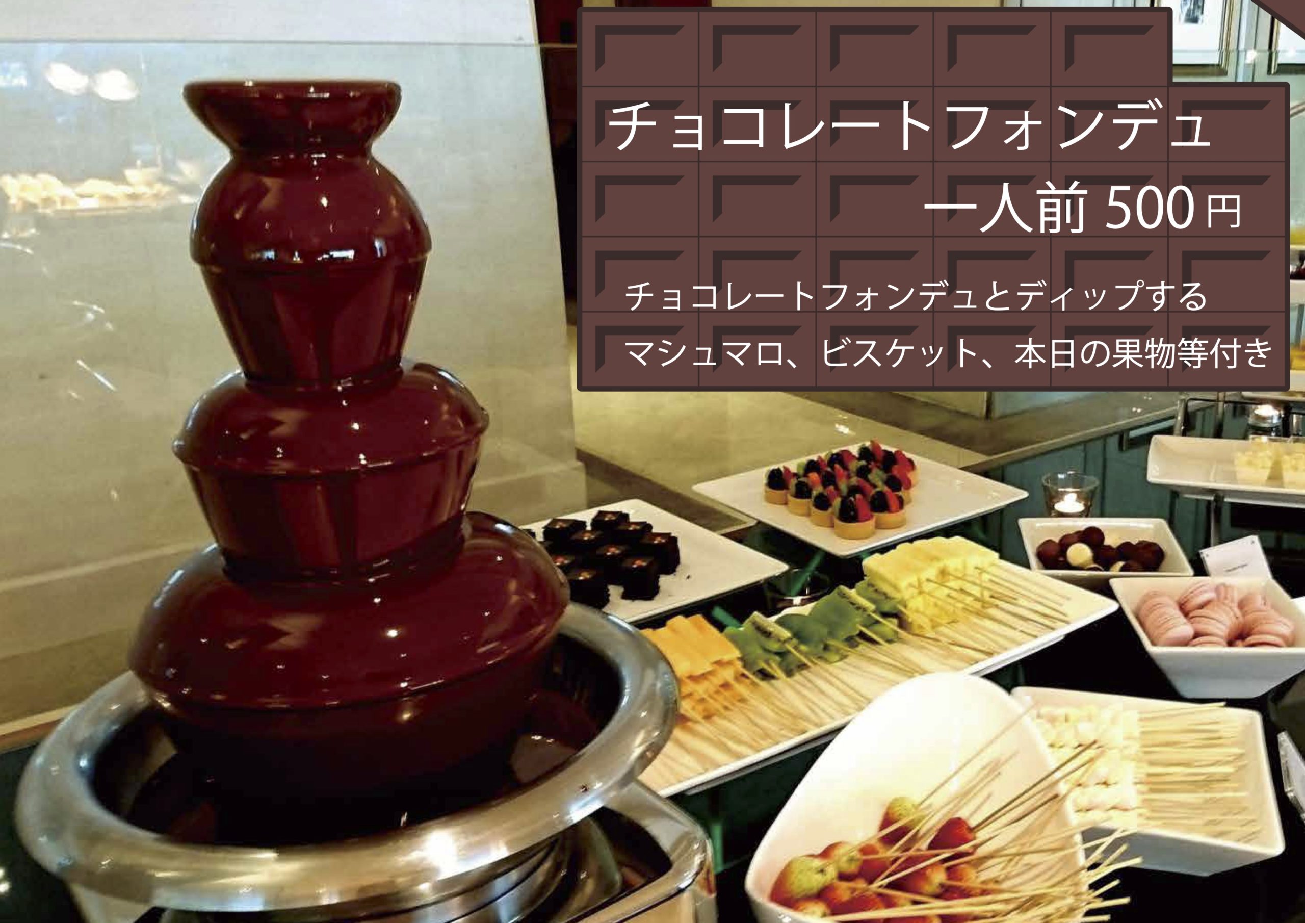 高級ベルギーチョコに、マシュマロや本日の果物をディップしてお楽しみください。こちらは、飲み放題にプラス500円(お一人様あたり)になります。飲み放題ご予約の際、こちらもご予約をお願いいたします